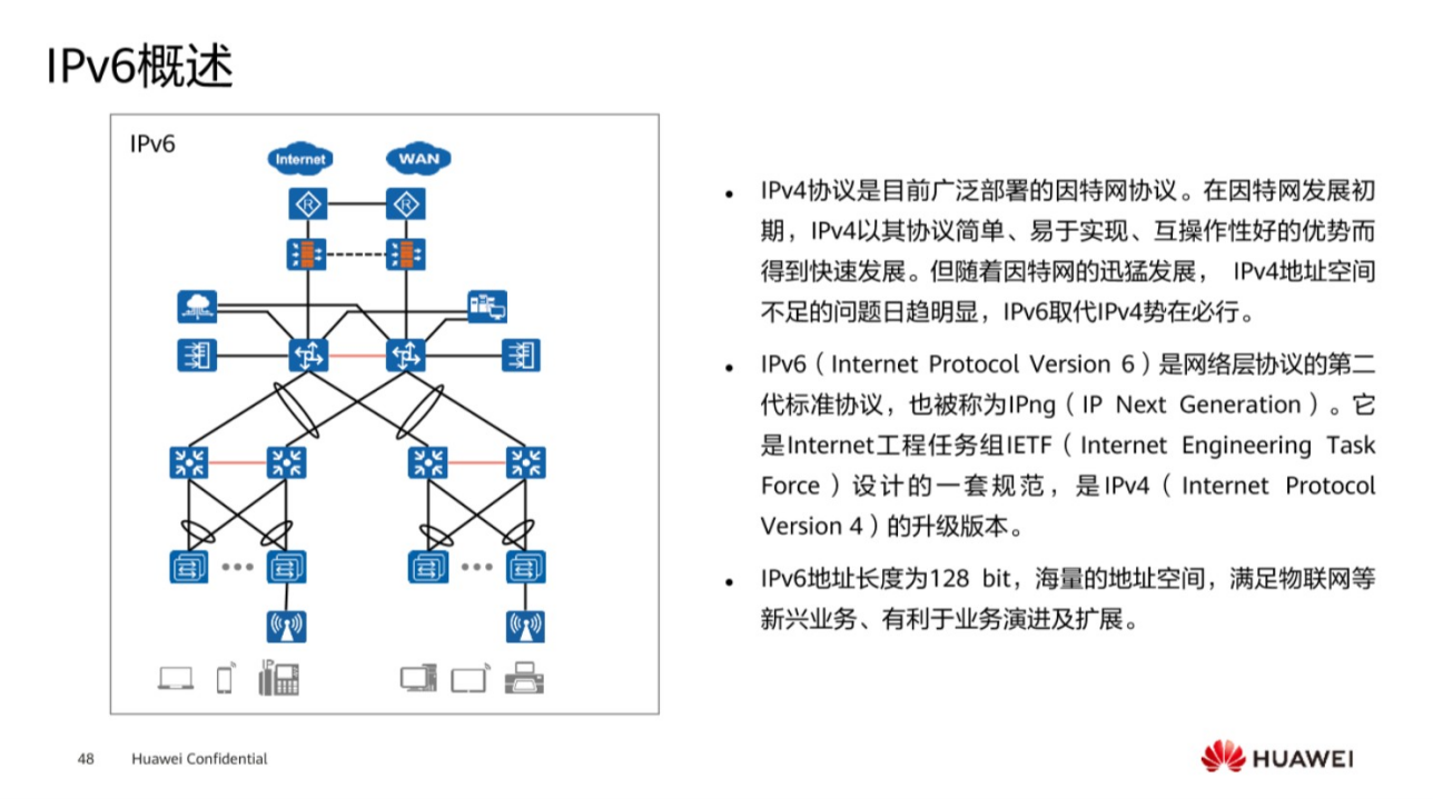 IPv6技术很早之前就已经开始实施进行推广了,为什么会有IPV6技术的产生,IPv4分为公有地址和私有地址的原因在于无法满足终端设备的接入,给每一个设备都去分配一个IP地址,于是为了节约IP地址,提出了公有和私有IP地址以及NAT网络地址转换等等一些其他技术,于是面临着IP地址即将枯竭,或者不够用的场景,于是推出了IPv6,IPv6相当于在IPv4的基础上面对地址进行了扩展,从原来的32位的IP地址扩展成了128位,因此IPv6有一个称号,号称地球上的每一粒沙子都可以分配到一个IPv6的地址,由此可见,他地址数量级别是非常大的。IPv6和IPv4协议相比,它的地址结构以及它的实现原理也远远复杂多得多。IPv6它称为IP下一代协议,一共有128比特,有了这样一个足够数量级的地址之后,能够做一些什么事情呢?在未来的网络世界里面,所有设备都能够配置IPv6,最后接入到用户,然后就会形成一个万物相连的世界,于是物联网就这样产生了。因此IPv6的推广对于未来生活而言,其实是有一个非常重要的战略意义的。