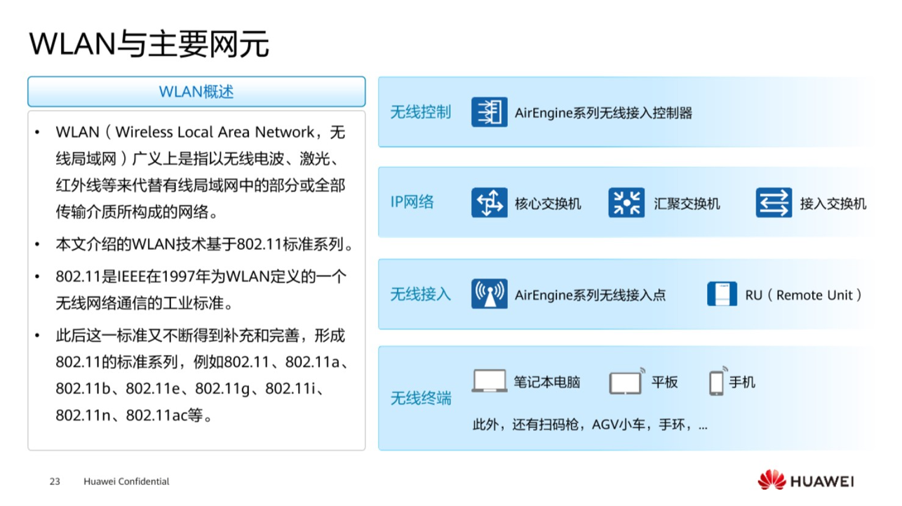 无线技术,是现在一个非常流行的一个技术,无论是在家,或者说在企业办公,或者去咖啡厅,任何一个场所,可能第一件事情就是打开手机,寻找有没有可以连接的WIFI,提供一个网络接入的这样一个功能,那么WLAN设计的最初目的,是为了取代有线办公这样的一个功能,使得办公更加便捷,那么本身介绍了WLAN技术,其实就是日常生活中所使用的WIFI,这是基于一个802.11标准,这么多的标准802.11a/802.11b/802.11e等等,不同的标准其实是去实现终端用户接入无线网络所使用的带宽以及它的频率。