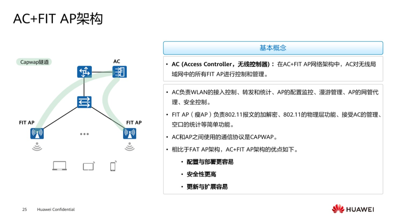 瘦AP顾名思义就是AC和AP的这样的一个结合,AC主要是对AP进行一个控制和管理,而AP只负责一些简单关于数据的加解密,接入用户,还有一些空口统计等一些功能。而AP和AC之间如何去进行关联呢?那就是要通过通信协议,CAPWAP协议去实现,相较于胖AP,瘦AP的架构,它的优点可以看到,部署更容易,安全性更高,扩展性更容易,比如说企事员工全部是通过无线上网的方式,进行去连接网络,这个时候需要对设备AP进行一个版本的更新,当所有员工下班之后,可以在AC上统一下发更新,对于AP定时进行更新,第二天当员工上班的时候,并不影响他的工作,仍然进行上网,这样维护起来更加容易。现比如说某一个AP坏了,在AC上会发现该AP没有办法上线,根据网络架构,去判断哪一个AP坏了,只需要更换AP硬件,就可以实现重新将该区域的网络进行恢复。