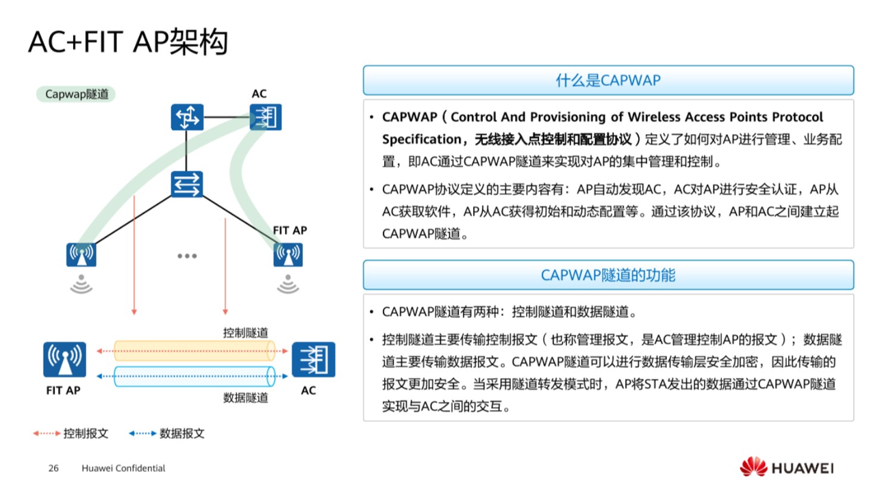 其中有一个非常重要的协议,在 AC和AP之间,建立一条隧道来管理AP,那就是CAPWAP协议,这个协议所定的内容是什么呢?主要有AP如何去发现AC,然后AC对AP有一些安全认证。其中关于隧道的方式一共有两种,一种是控制隧道,一个是数据隧道,所谓的控制隧道,就是在AC和AP之间进行一个管理通过控制隧道。数据隧道是为用户转发流量。