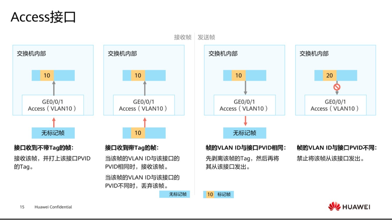 其中Access端口它一般是用来连接终端设备,或者服务器这样的一个端口类型,从它接收到的数据,因为它所连接的一般是PC或者服务器,所以从终端设备收到的数据一般是不携带任何标签的,当它从终端设备收到的数据中,会查看里面是否携带标签,如果未携带标签的话,就会打上自己端口上的标签,按图中的案例,它就会打上VLAN10,但是如果将该接口设置为Access接口,同时它连接的不是终端设备,是另一台交换机,从该交换机转发到该接口收到的数据帧里面,携带了标签,它会将这个标签的VLAN ID和自己端口的PVID进行比对,如果是相同的话,他就正常接收,内部再处理,如果是不相同的话,就直接进行丢弃。Access在发送数制帧的时候,当它从交换机内部收到一个数据,想要从G0/0/1接口发出去的时候,它会查看该数据帧里面的VLAN ID,和自己本身接口的PVID是否相同,如果是相同的话,它会将标签剥离,然后从该接口发出去,如果说该帧的VLAN ID和自己接口的PVID不同,它就禁止从该接口发出去。一般情况下,Access端口是连接终端设备的,所以它收到的数据帧,是不携带任何标签的,打上该端口的VLAN ID,然后发数据的时候一般也是发给终端设备,这个时候进行对比,如果相同VLAN就脱离,如果不同,就拒绝发送。