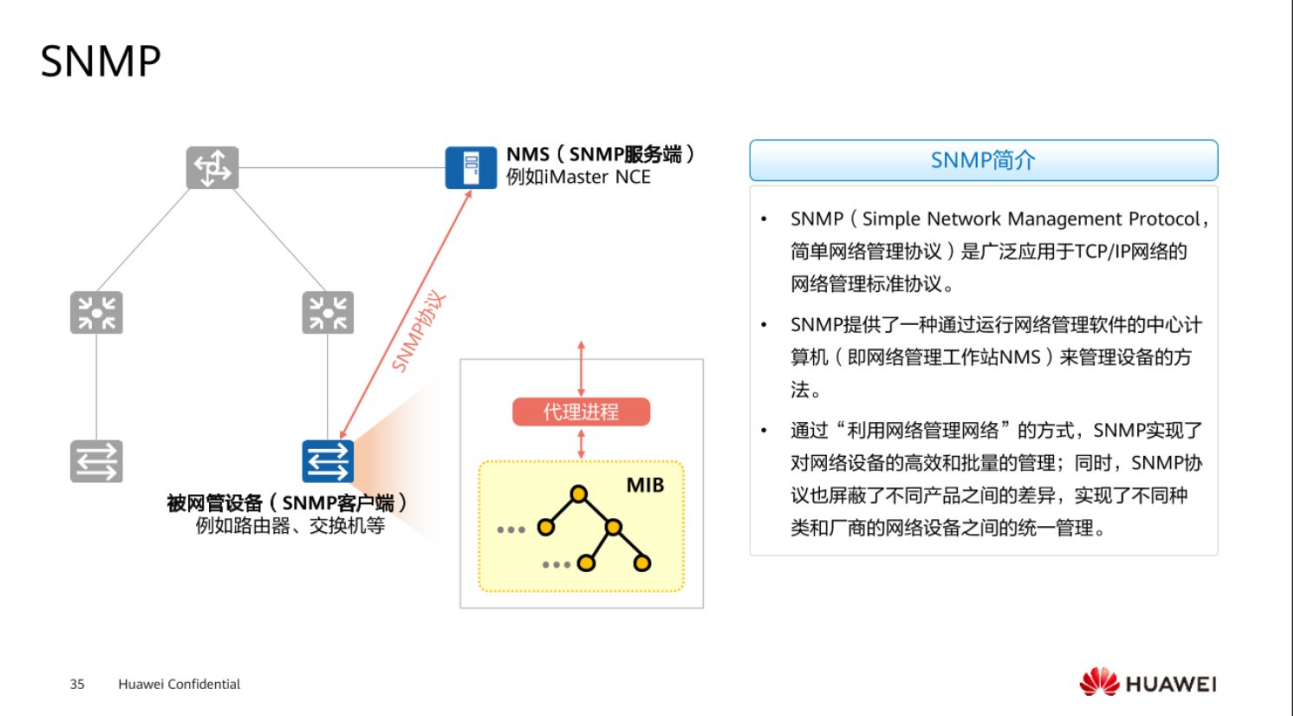SNMP协议用起来也是非常广泛,它摒弃了不同产品之间的差异性,网管通过SNMP协议,只要硬件路由器交换机支持SNMP协议,网管设备就能够进行统一的纳管,然后查看设备的一些运行状况,帮助后期维护。SNMP协议已经成为各个厂商所定义的一个标准协议,基本上所有厂商的设备都会支持SNMP协议,然后通过该协议就能够实现针对不同厂商不同类型的设备进行统一的纳管。