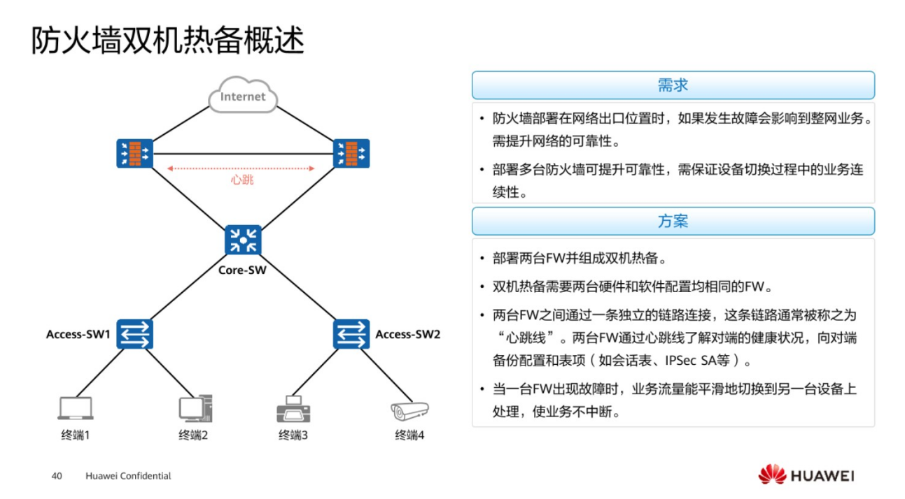 防火墙有时候也需要做一个备份,这个时候就会涉及到防火墙的双机热备,关于防火墙的备份就类似于提高网络可靠性这样一个需求,在防火墙之间需要去部署一个心跳连线,通过心跳连线去同步相关的会话表项和配置。当主防火墙发生故障之后,依然可以通过备用防火墙去实现正常数据交互的通信,保证业务的连续性以及不中断。