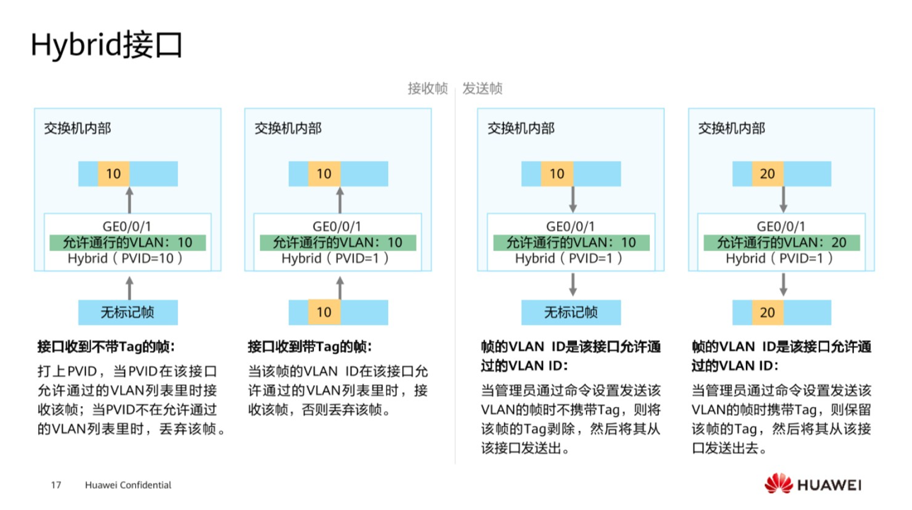 Hybird端口实际上它关于数据帧的接收和转发是否打标签和是否脱标签,其实是非常灵活的,用户完全可以通过命令自行去定义。