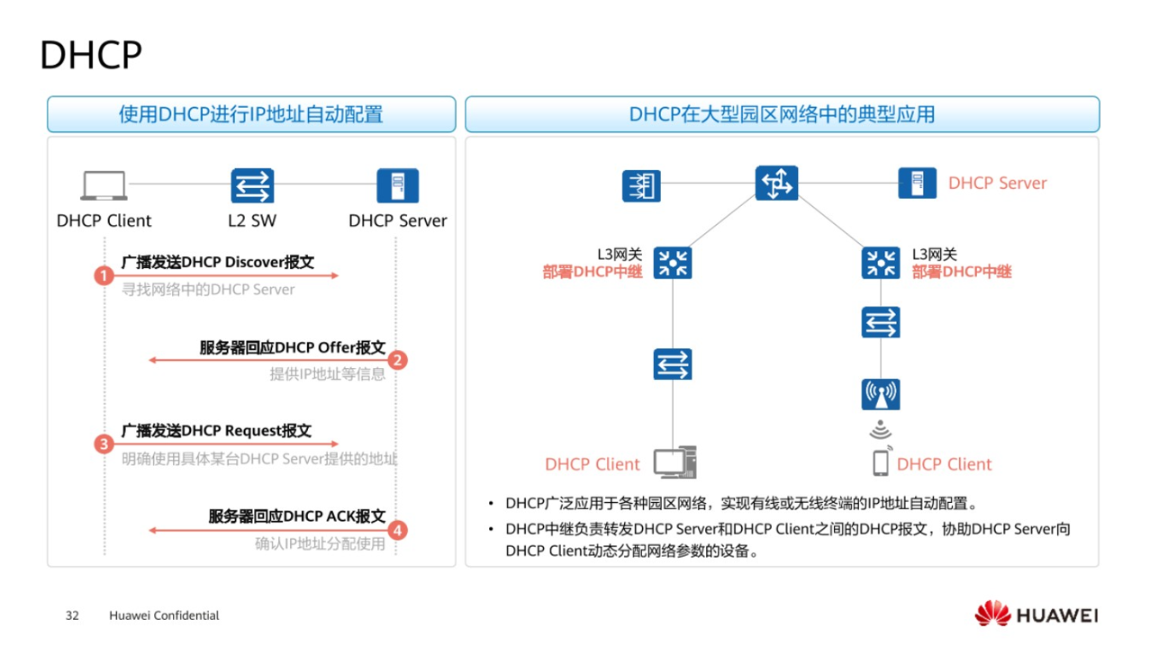 正常终端设备想要上网的时候,需要IP地址,掩码,网关,DNS,等一系列关于IP地址的一些应用,这个时候管理员如果手工进行配置,如果公司的规模很大,那么对于管理员是一个非常累的活,同时一旦某个人自己更改了IP地址,就可能造成他的IP地址和别人的IP地址冲突,这样导致两个人都上不了网,同时管理员排查起来也是非常麻烦,于是为了解决这个问题,对IP地址进行统一集中管理和减轻管理员的工作,就产生出了DHCP。