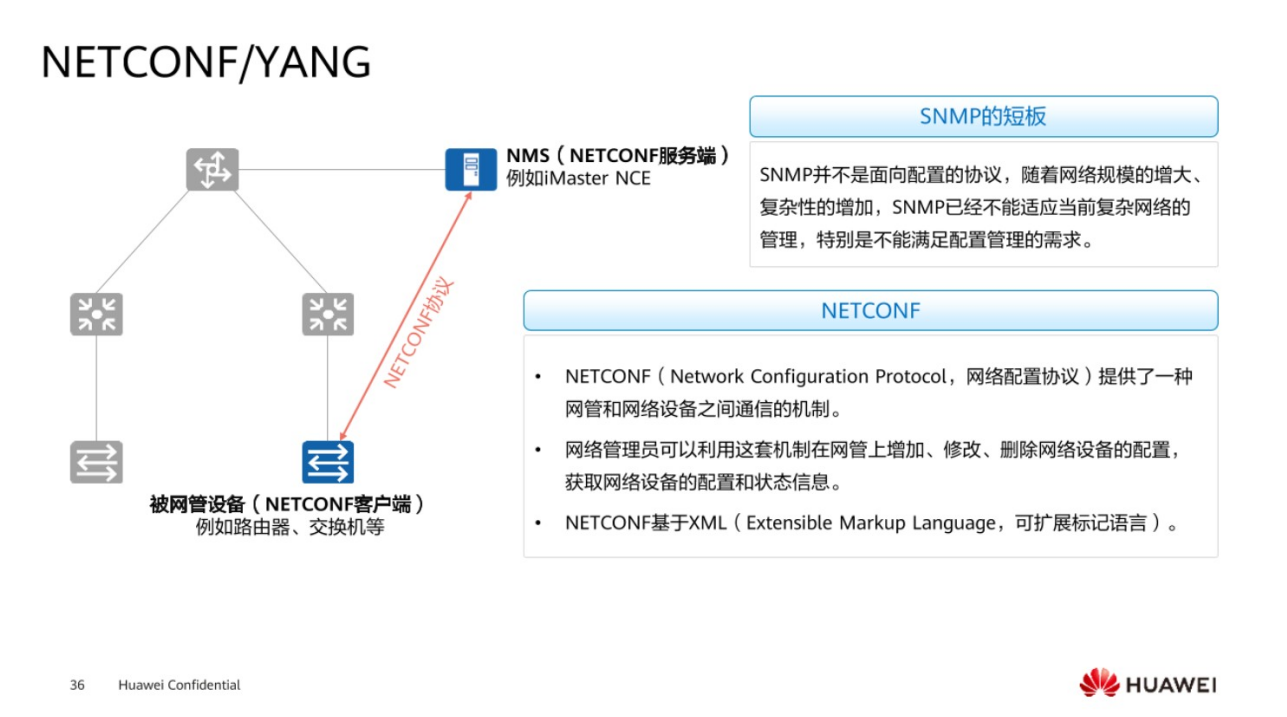 网管能够通过SNMP去发现设备进行统一的纳管和维护,但是关于设备配置方面,SNMP只能做一些非常简单的配置,比如说IP地址,VLAN等等。如果面对一些非常复杂的网络,需要进行一些非常复杂的配置,SNMP是无法去下发的,因此通过NETCONF以及YANG,就可以对设备进行统一的下发配置,而不需要管理员一台一台的登录到设备上,进行传统的命令行这样的一个配置。
