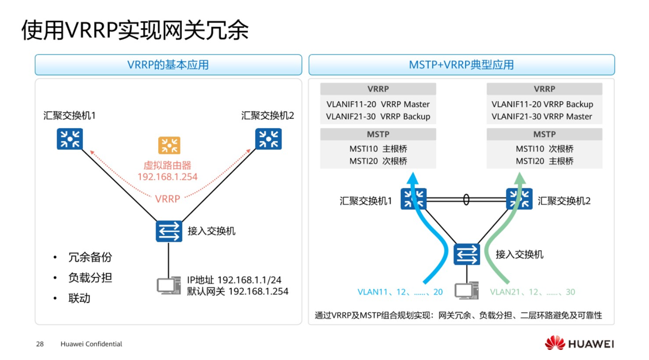 生成树MSTP可以去解决二层环路,同时VRRP能够解决网关备份这样的一个问题,因此这两个技术在传统的网络里面一般会将它们结合在一起使用。比如说左边的汇聚交换机1是作为VLAN11-vlan20的主网关,同时在MSTP里面,汇聚交换机1是作为主根桥,数据流量是从左边走的。而关于VLAN21~30的主网关,以及主根桥是由汇聚交换机2来诞生的,流量是从右边走的,这样就能够即解决了关于二层环路的问题,双能够实现一个流量的负载分担。