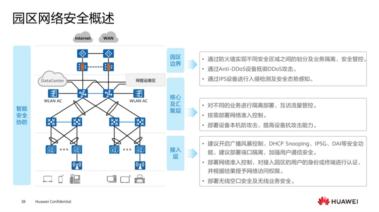 防火墙是用来去实现不同安全区域之间的划分,帮助去实现业务的隔离和管控。面临的一些DDoS攻击,入侵检测以及安全态势感知,这些都是在园区的边界部分。