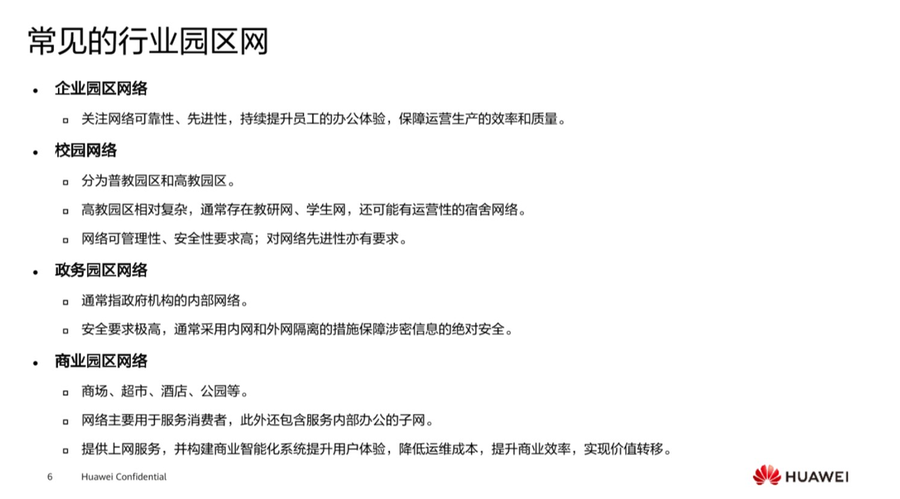 园区网根据不同的行业属性,它的网络架构也是不一样的,其中企业网络对于可靠性和先进性的要求就比较高,这样的话就需要保证网络的质量,提升员工的办公效率。在校园网里面其实也区分的,分为普通校园和高校校园,其中高校校园网就非常复杂了,因为它里面包含了比如说教研网,这样对于安全性的要求就很高,学生网,为正常宿舍的学生提供访问网络的这样的一个用途,当然还有一些运营型的宿舍型网络,可能学生经营着某些网站之类的需求。政务园区网,一般是针对政单位所使用的这样的一个网络,那么它的安全系数要求是非常高的,因为它的内部涉及一些机密的资料,一旦某些机密资料不小心外泄,那可能产生重大的威胁安全隐患。最后的一个商业园区网络,比如说常见的超市,酒店以及机场等,面对这样高密度人群的应用场景,希望既能为用户提供网络,同时能够降低运维成本。