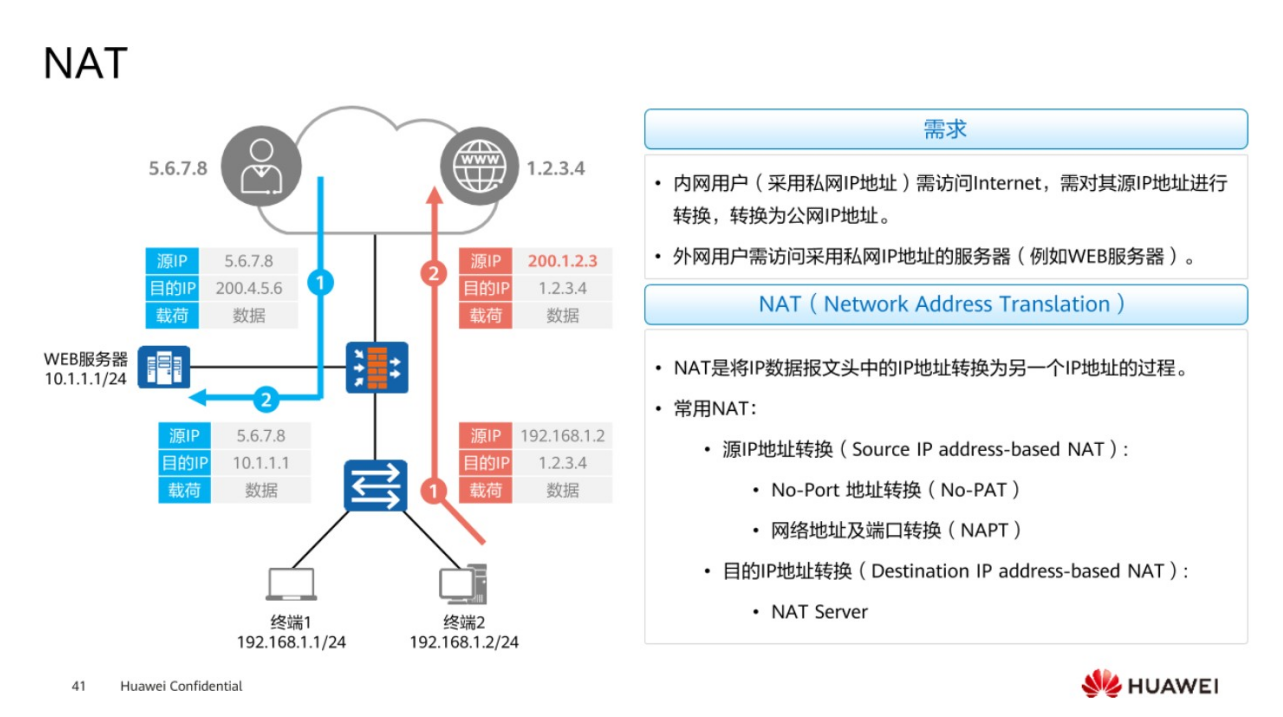 防火墙作为园区最终出口的一个重要的安全点,最后是通过防火墙连接外部网络,因此需要在防火墙上面去部署网络地址转换协议NAT,主要是基于IP地址和端口号的转换,来实现一个私网地址转成公网地址,然后去访问外部网络这样的一个技术,从而达到节约P地址这样的一个功能,同时隐藏了内部网络的一个架构。