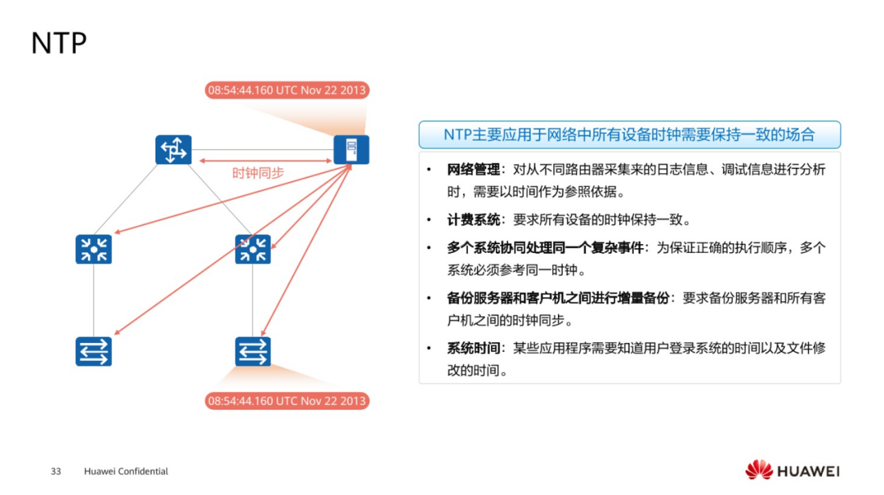时钟同步协议NTP,时间在现实生活中是非常重要的一个概念,对于服务器而言,当然也是一个非常重要的概念,比如说在后期维护需要进行日志的同步,网络的管理都需要通过时间作为依据,帮助去进行一个参考,如果网络里面如果有多台设备都需要去配置时间,一台一台的去配,非常麻烦,因此可以通过NTP这个协议帮助去实现。可以设置某一台服务器作为NTP这样的一台服务器,给它部署相关的时间,然后通过时钟同步协议NTP,将它的时间同步到交换机和路由器上面,保持时间的一致性,从而减轻管理员的一个工作量。
