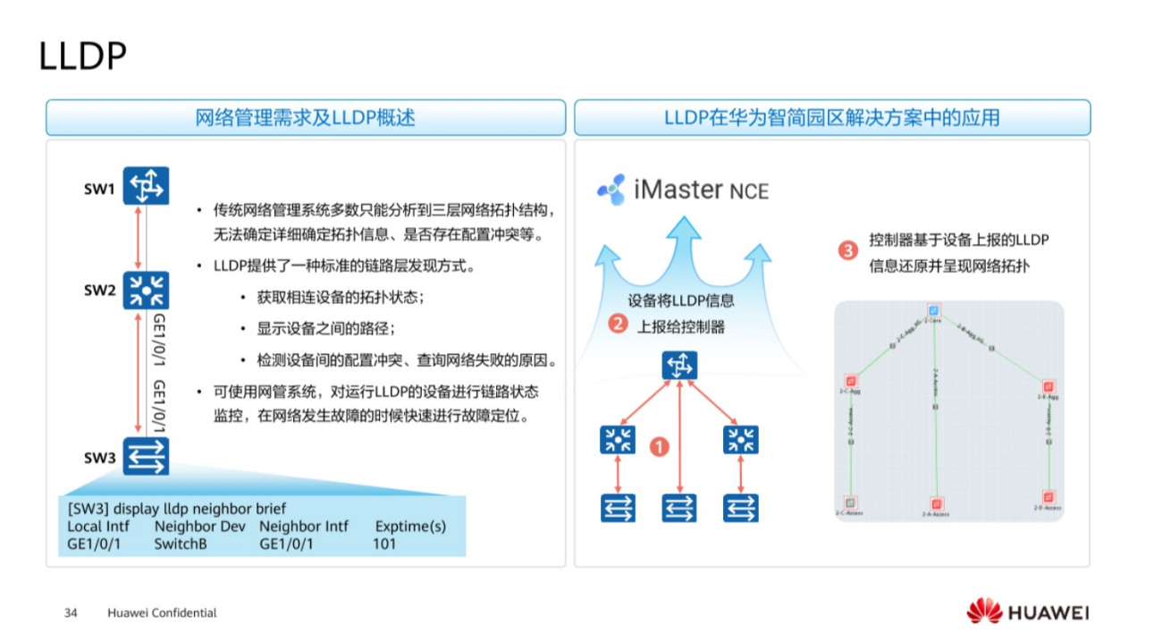 链路层发现协议LLDP,为什么会需要二层有一个发现协议呢?传统的网络管理设备,通过三层只能分析到三层网络拓扑,三层的网络拓扑架构和实际的物理的网络架构还是有一些区别的,比如说做了一些虚拟化,将多台设备逻辑上变成一台,或者说将一台设备虚拟成多台设备,这样就不能够直观明了的去判断物理连接组成的网络架构是怎样的,因此二层的LLDP就提供了一个标准的链路层发现协议,直观的去了解网络的组成架构是怎样的,它通过获取设备之间的相关IP地址接口信息,然后相关的连线,最后在网管设备上,比如说华为的iMaster的NCE,就能够直接的呈现网络的拓扑连接是怎样的。一旦某一条链路或者某一个设备发生故障,就能通过LLDP协议呈现的网络拓扑,非常直观快速的定位网络故障在哪台设备上产生的,然后进行后期的维护。配置也非常简单,只需要在接口开启LLDP的功能。