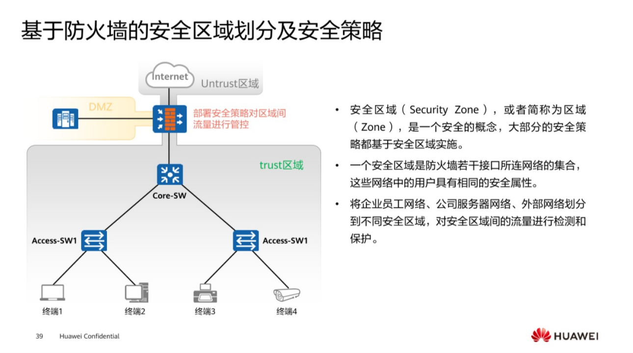在安全里面,常规的,一般情况下,第一个是通过防火墙进行部署的,它将不同的端口设置了不同的区域,这个区域是基于安全策略去实现不同接口之间流量进行流动,匹配安全策略,然后执行相应的操作,一般情况下,防火墙的区域分为信任区域,非信任区域,本地区域, 以及DMZ区域。当数据流量进入防火墙之后,根据区域之间的安全策略,去实施这样的流量是否正常放行或者拒绝。