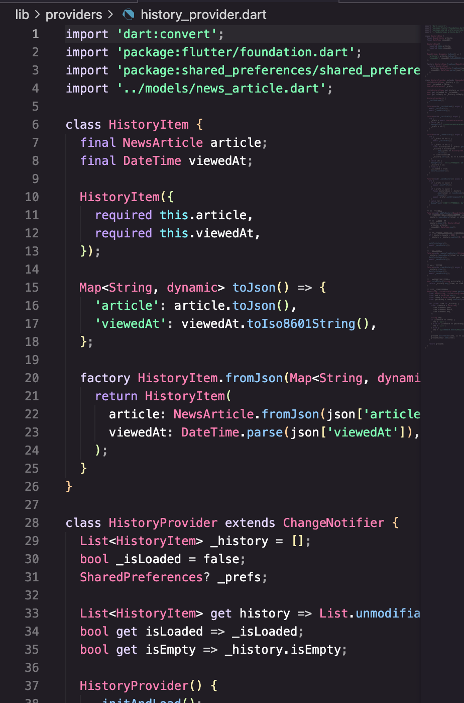 这段代码定义了NewsProvider的基本属性。ChangeNotifier是Flutter提供的一个mixin,它提供了notifyListeners()方法,调用这个方法就能通知所有监听者"数据变了,该刷新了"。