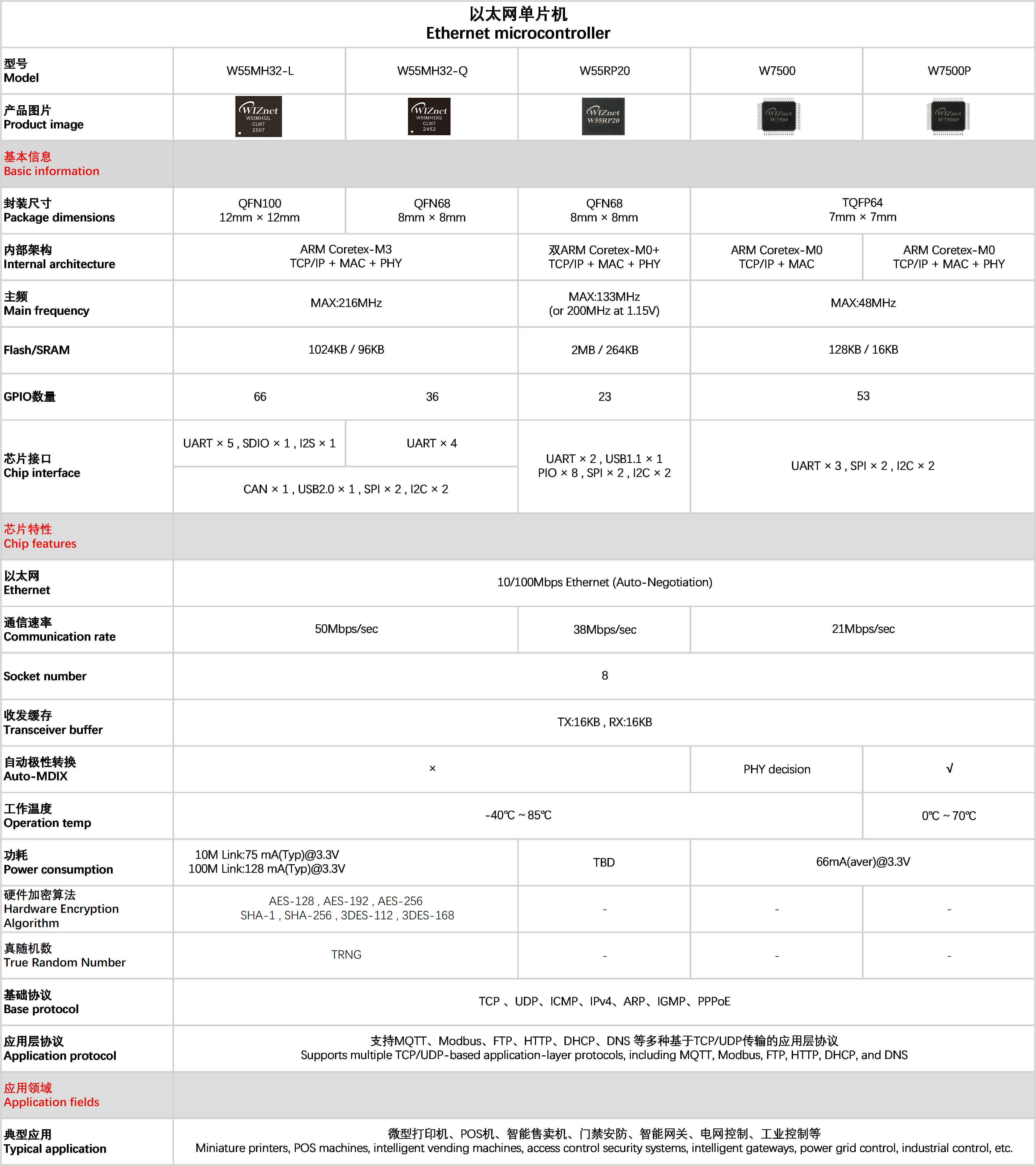 本文聚焦 WIZnet 5 款核心以太网单片机(W55MH32、W55MH32-L、W55MH32-Q、W55RP20、W7500P),各型号在算力性能、