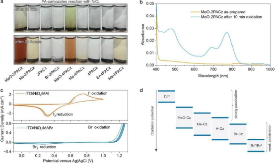 (a) PACz与NiO₂粉末反应10分钟及24小时后的溶液颜色变化(b)MeO-2PACz在乙醇/水溶液中与NiO₂反应前后的紫外-可见吸收光谱(c)在含约10 mM MAI与MABr的0.5 M KCl电解质中,NiOₓ薄膜的循环伏安曲线(d)由循环伏安测量得到的磷羧酸咔唑、I⁻/I⁰、Br⁻/Br⁰的相对氧化电位比较