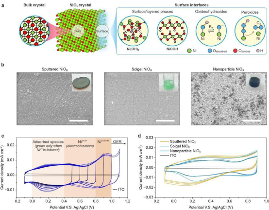 (a) NiOₓ表面结构与物种示意图(b)不同NiOₓ薄膜前驱体的照片及对应的SEM图像,(c)纳米颗粒NiOₓ薄膜的连续循环伏安扫描图(d)不同类型NiOₓ的循环伏安扫描对比