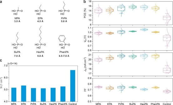 (a)不同烷基膦酸分子结构(b)基于不同烷基膦酸钝化NiOₓ的钙钛矿太阳能电池性能(c)不同烷基膦酸在NiOₓ上对应的N值