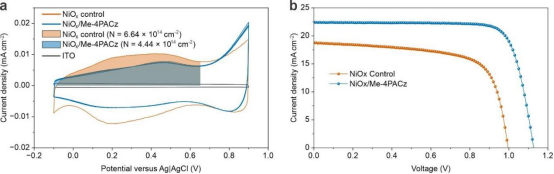 (a)纳米颗粒NiOₓ与NiOₓ/Me-4PACz的循环伏安曲线(b)基于NiOₓ与NiOₓ/Me-4PACz的钙钛矿太阳能电池的电流密度-电压曲线