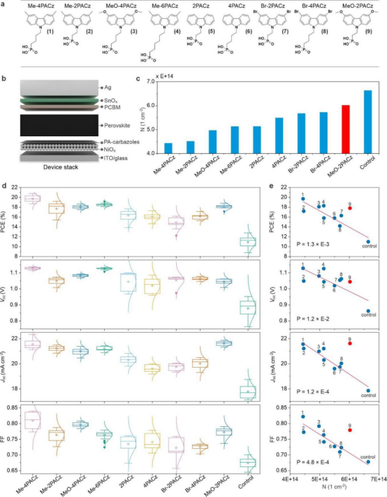 (a)磷羧酸咔唑类分子结构(b)不同磷羧酸咔唑分子在NiOₓ上的N值(c)基于不同磷羧酸咔唑钝化NiOₓ的钙钛矿太阳能电池性能(d)N值与钙钛矿太阳能电池性能参数之间的相关性