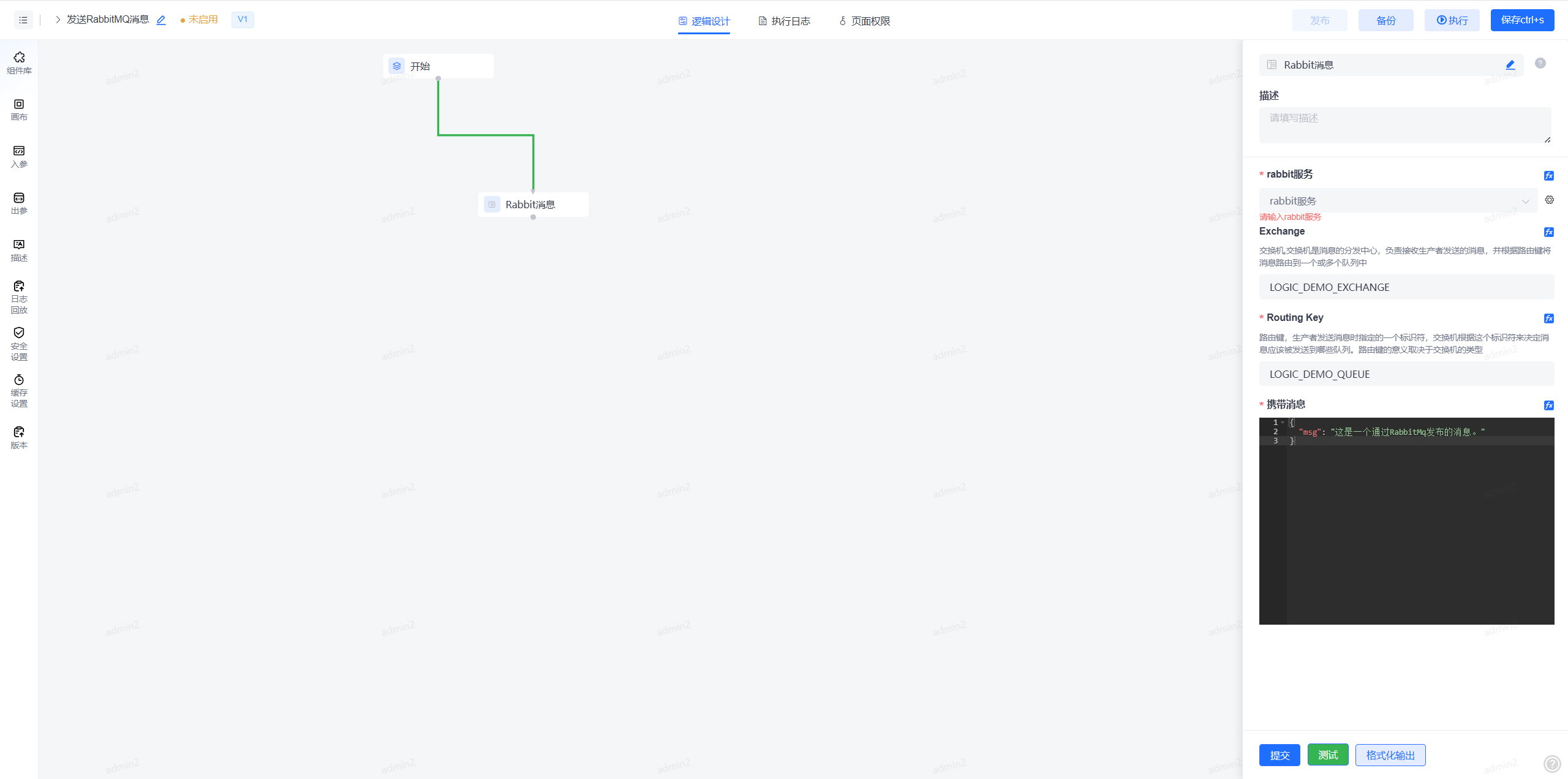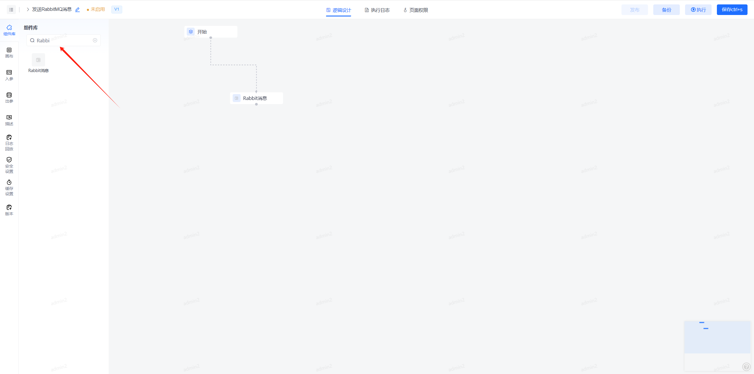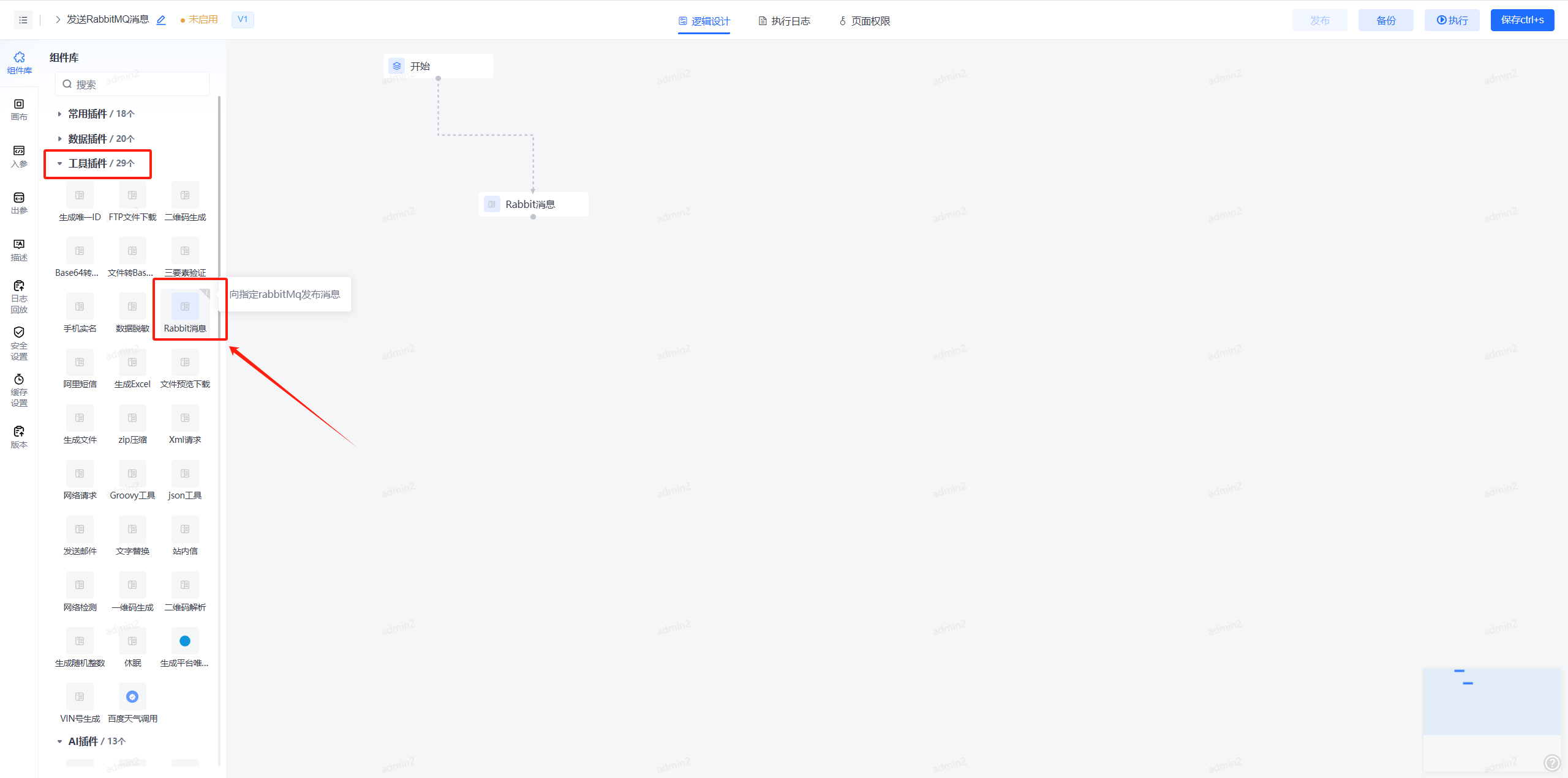 1、使用Rabbit消息节点,可在组件库-工具插件中找到"Rabbit消息"节点。