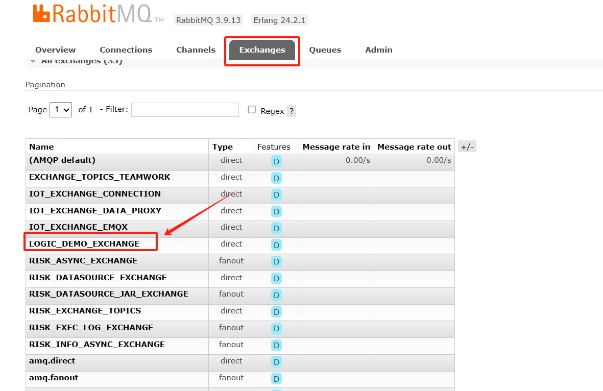 4、回到Exchanges,找到前面新增的LOGIC_DEMO_EXCHANGE,并点击。