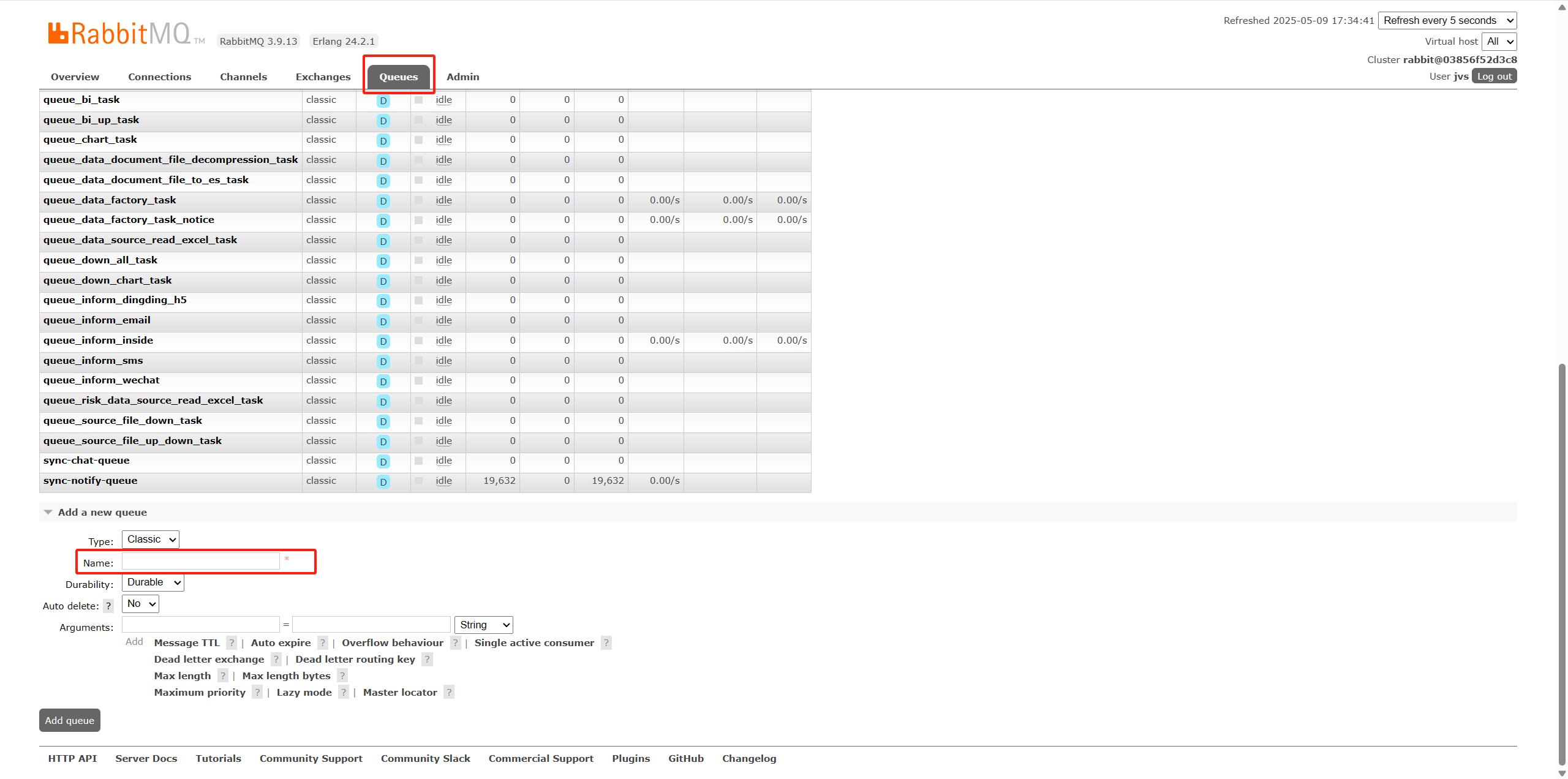 3、打开RbbitMQ后台管理页面:jvs-rabbitmq:15672或者ip:15672。登录账号密码默认为jvs。