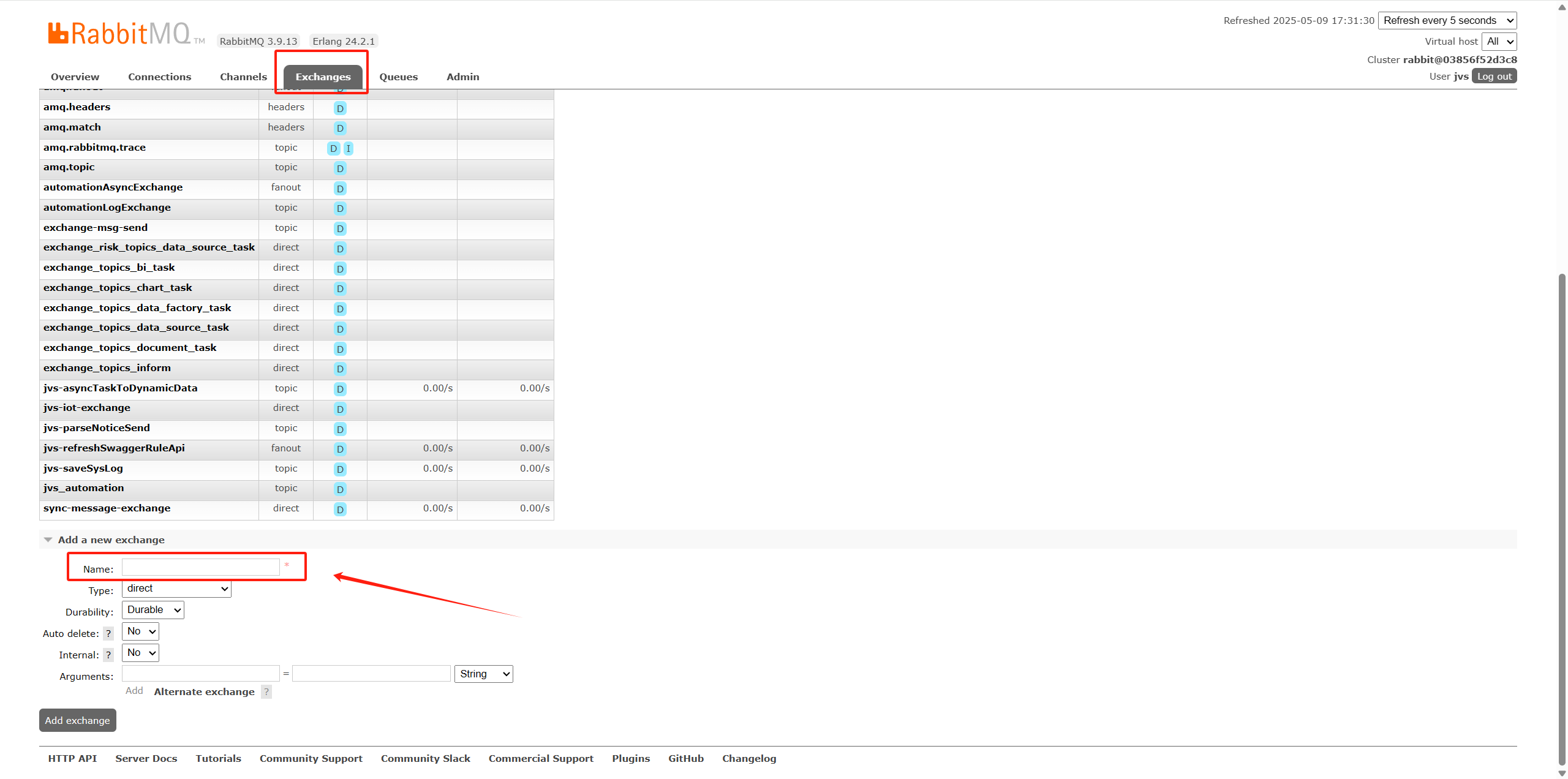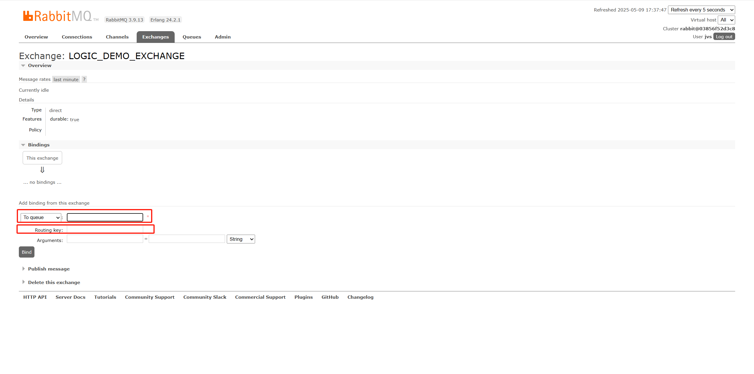 Exchanges中新增一个exchange,并填写上一步中设置的字符串。此处为"LOGIC_DEMO_EXCHANGE"。