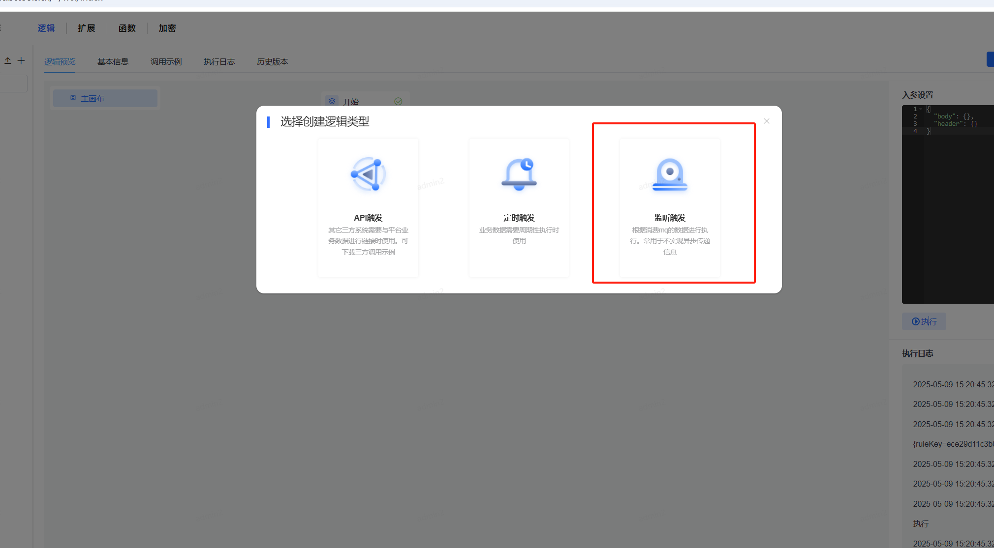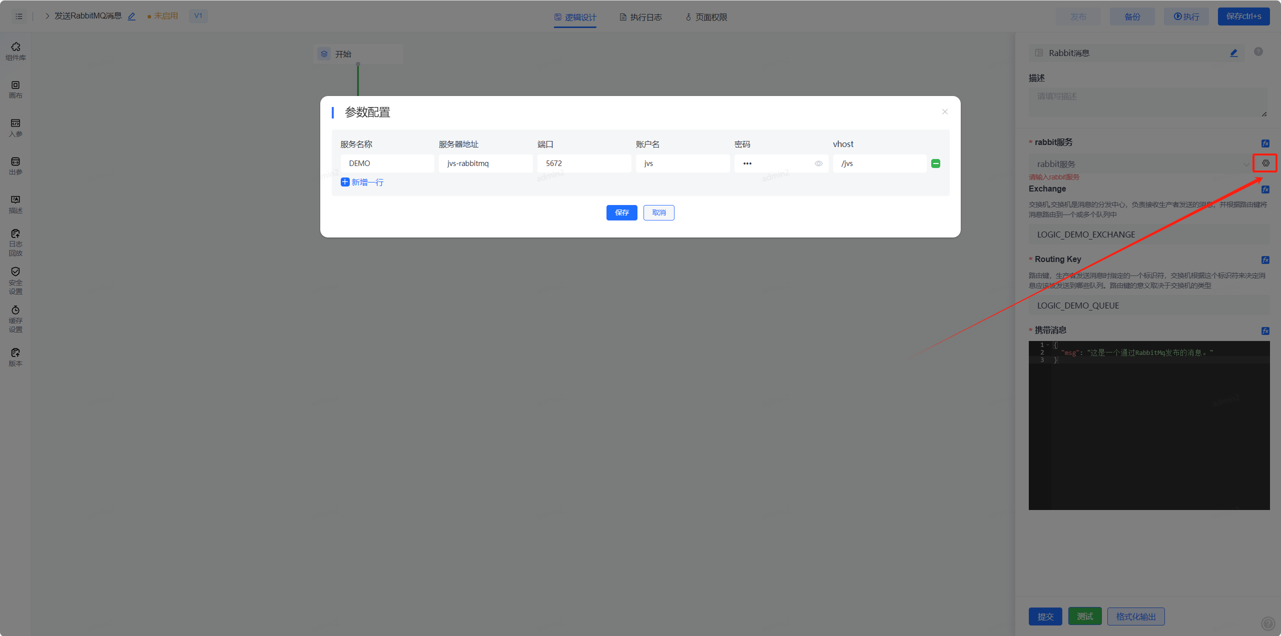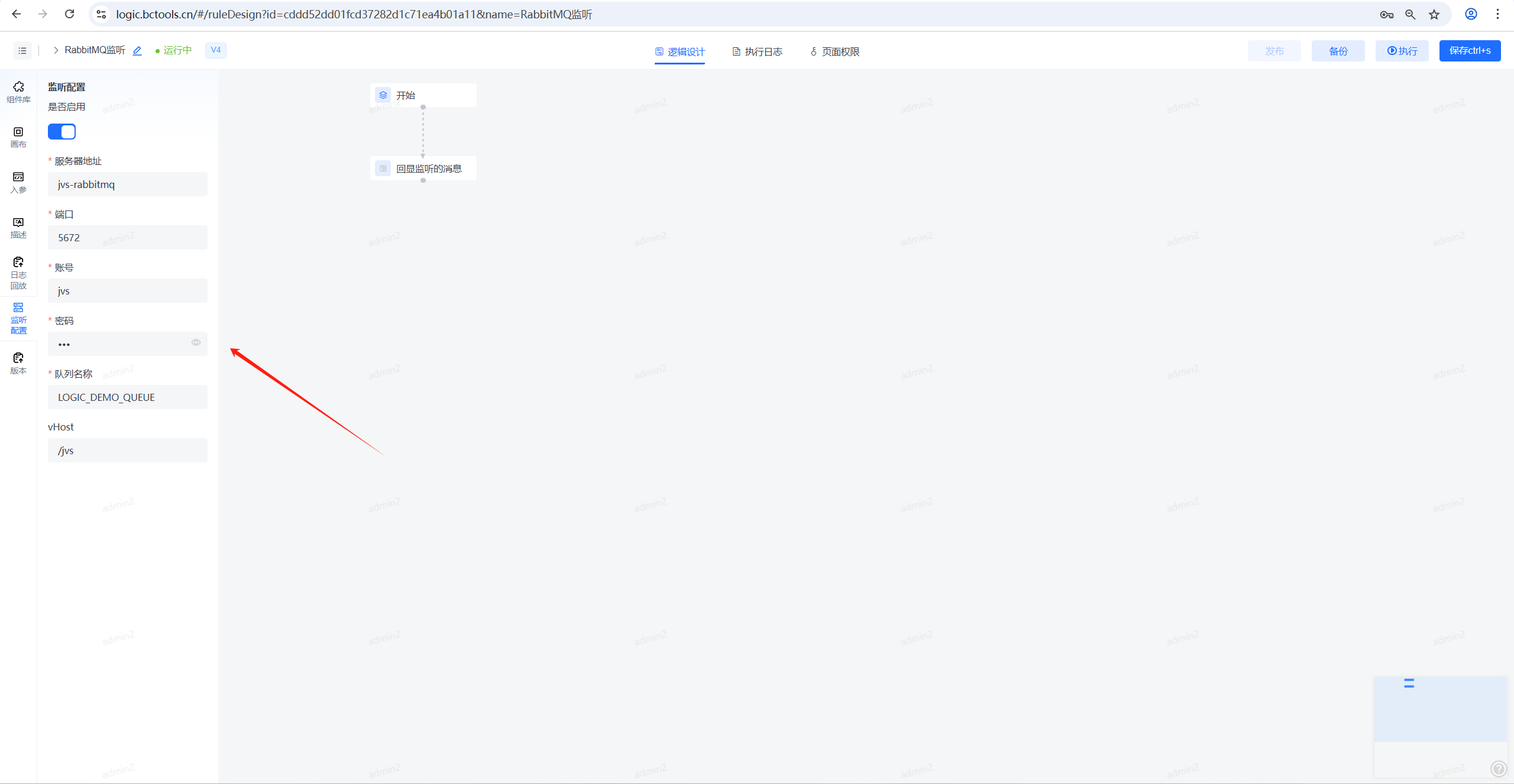 1、创建逻辑后,左侧设置"监听配置"。打开启用开关,在显示的配置项中配置好部署的rabbitMQ信息。注意:服务器若使用别名,需要在服务器hosts中配置对应的ip地址映射。