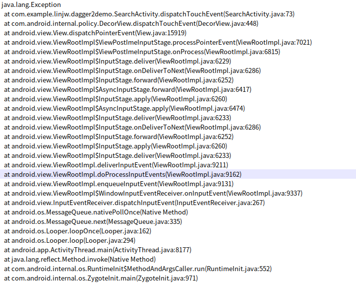 01-12 12:01:15.435 522 2179 I am_anr : [0,2142,com.example.linjw.dagger2demo,818462534,Input dispatching timed out (3c73418 com.example.linjw.dagger2demo/com.example.linjw.dagger2demo.SearchActivity (server) is not responding. Waited 5005ms for MotionEvent(deviceId=4, eventTime=162728390000, source=TOUCHSCREEN | STYLUS | BLUETOOTH_STYLUS, displayId=0, action=DOWN, actionButton=0x00000000, flags=0x00000000, metaState=0x00000000, buttonState=0x00000000, classification=NONE, edgeFlags=0x00000000, xPrecision=22.8, yPrecision=11.1, xCursorPosition=nan, yCursorPosition=nan, pointers=[0: (1011.9, 359.0)]), policyFlags=0x62000000)]