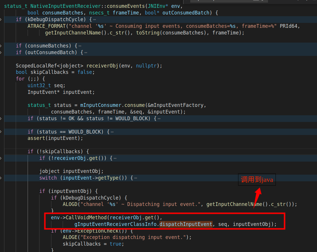 +status_t NativeInputEventReceiver::consumeEvents(JNIEnv* env, bool consumeBatches) {