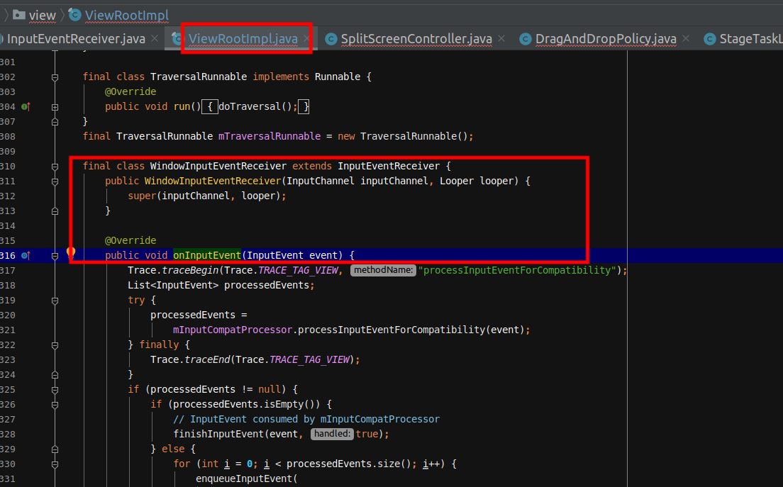 最后是会执行到ViewRootImpl中的WindowInputEventReceiver进行处理: