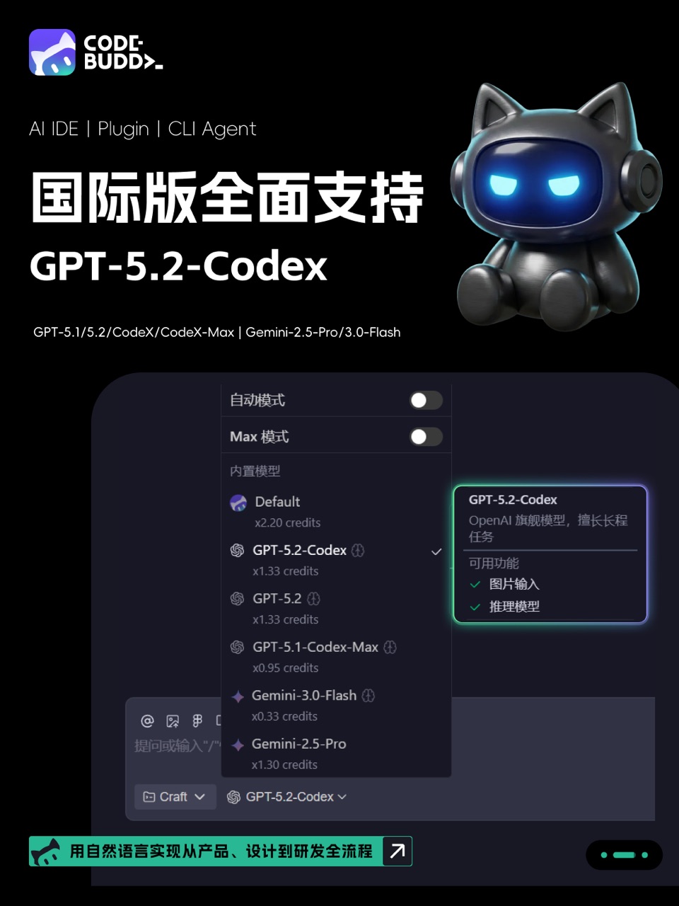 目前,CodeBuddy 国际版已在 IDE、插件、CLI 三端全面内置 GPT-5.2-Codex。开发环境全覆盖,助你提高开发效率,轻松搞定高复杂工程任务。🚀
