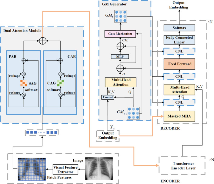 DACG模型主要由四个核心部分组成:视觉特征提取器、双重注意力模块(DAM)、引导记忆生成器和上下文驱动归一化层(CNL)。首先,使用预训练的ResNet-101作为视觉特征提取器,提取医学图像的块特征。双重注意力模块(DAM)集成在Transformer层之前,用于从位置和通道两个层面重建并细化医学图像特征,实现更精细和准确的全局特征提取。DAM包含位置注意力块(PAB),用于捕获图像中任意两个位置间的空间依赖性;以及通道注意力块(CAB),用于增强通道维度特征,两者融合后输出。上下文引导模块(CGM)旨在生成语义连贯且信息丰富的描述,包含一个引导记忆生成器(GM Generator),该生成器记录并持续更新上下文信息,并通过残差连接和门控机制避免梯度问题。上下文引导归一化层(CNL)替换了Transformer中的标准归一化层,将引导记忆(GMt)融入其缩放和偏置参数中,为解码器提供文本特征引导,从而提升长文本生成能力。编码器以DAM输出为输入,解码器则结合文本特征和编码器生成的隐藏状态,通过CNL进行词汇预测以生成报告。