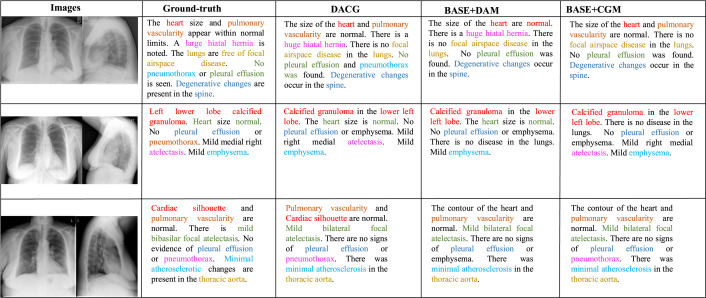 图6. DACG、BASE+DAM和BASE+CGM在三个样本上生成的报告以及真实报告示例。为了更好地突出报告中的差异,不同颜色突出显示了不同的医学术语。
