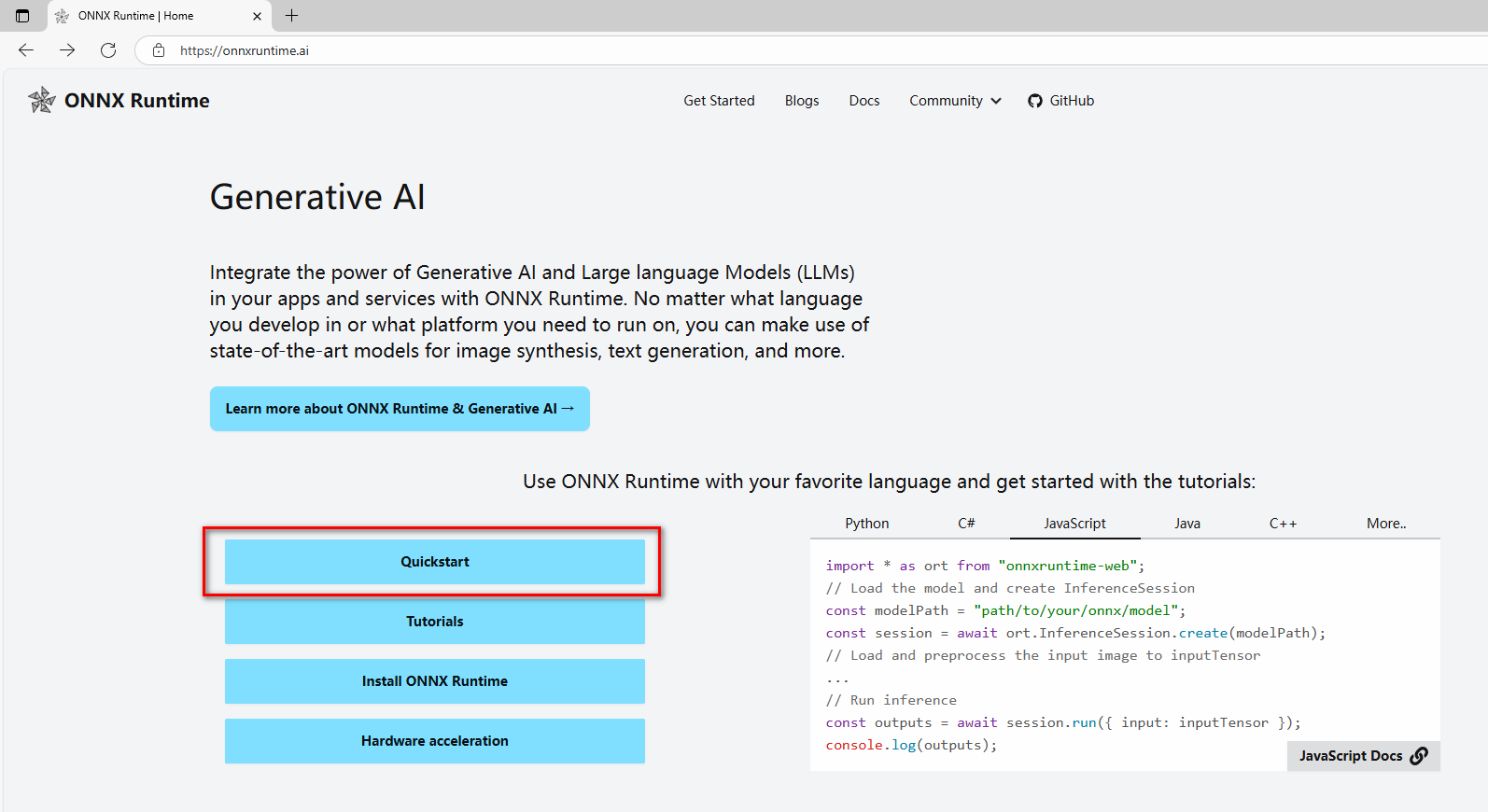 具体细节可以访问ONNX Runtime | Home,并选择Quickstart,如下图所示。