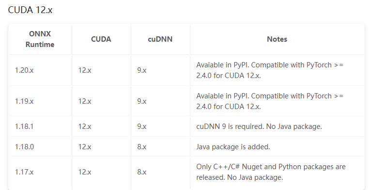 我cuda安装版本为12.x,cndnn为8.x,所以可选择1.17.x版本