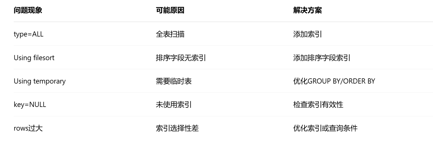 • Extra:额外信息(Using filesort、Using temporary需要警惕)