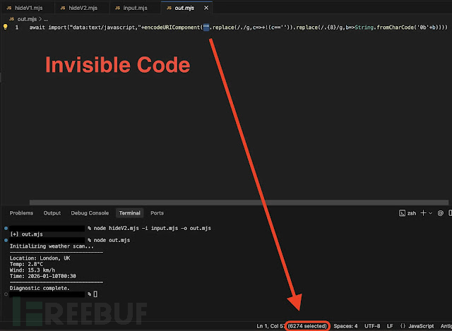 该工具将JavaScript转换为二进制字符串,其中0映射为零宽度空格(U+200B),1映射为零宽度非连接符(U+200C)。运行时,一个小型引导加载程序会解码并执行隐藏的有效载荷,使得代码在VS Code等编辑器中肉眼不可见。