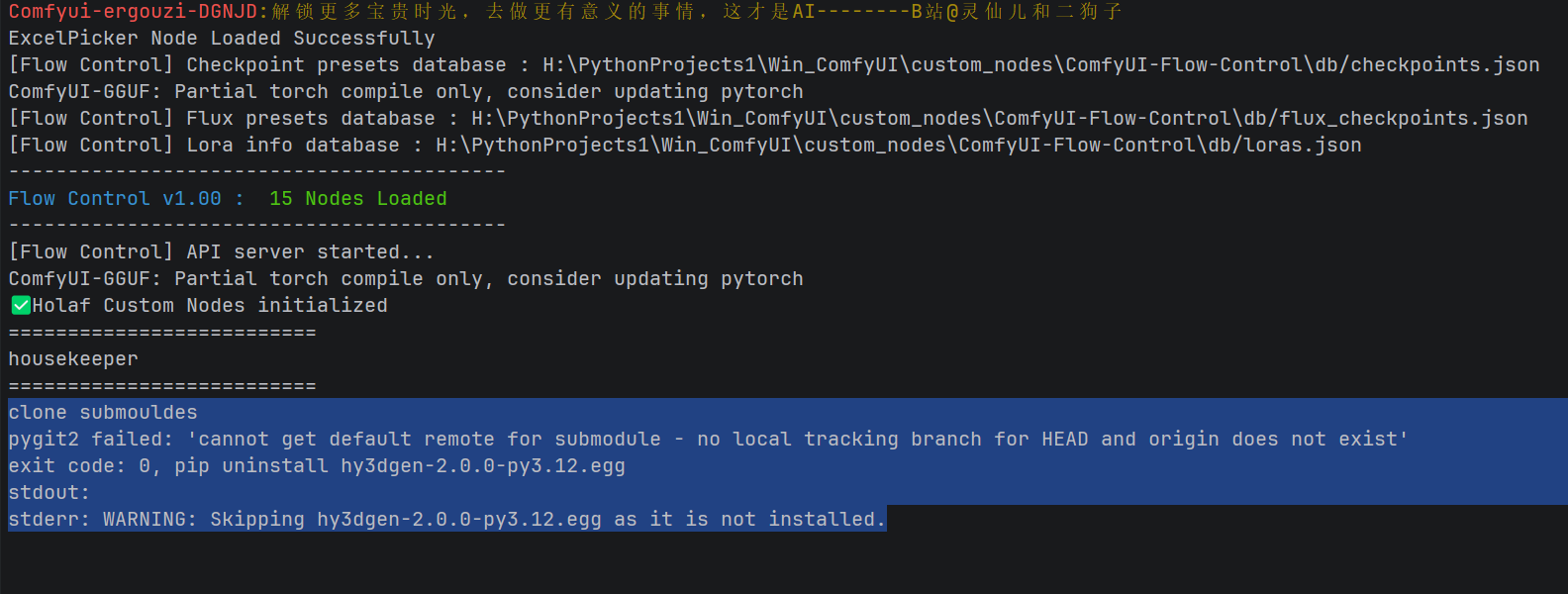 在安装 ComfyUI 的 Hunyuan-3D-2 插件后,本来经过艰难的安装和调试,并且已经用仓库自带的示例工作流跑通了,但发现 ComfyUI 每次启动时仍出现以下错误: