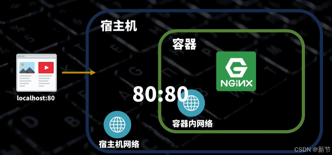 容器的网络和宿主机的网络是隔离的,例如运行了一个 Nginx 容器,容器内的 Nginx 监听了 80 端口。这时通过宿主机的 80 端口是无法访问到 Nginx 服务的。