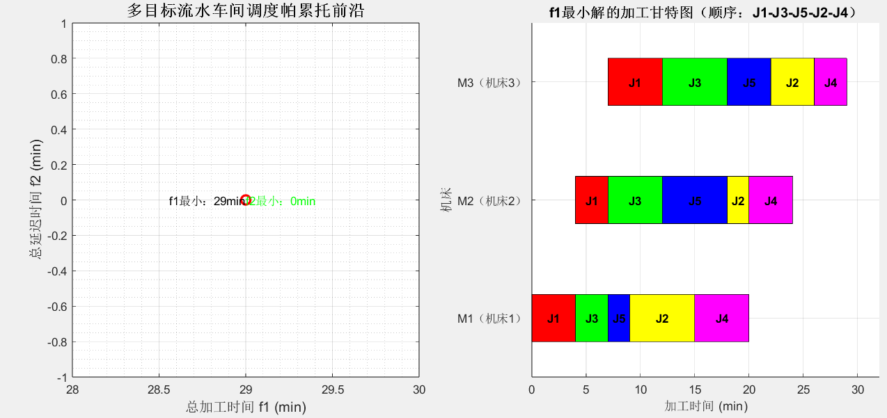 Average Average Generation Func-count Pareto distance Pareto spread 91 9100 0 0 92 9200 0 0 93 9300 0 0 94 9400 0 0 95 9500 0 0 96 9600 0 0 97 9700 0 0 98 9800 0 0 99 9900 0 0 100 10000 0 0 101 10100 0 0 102 10200 0 0 Optimization terminated: average change in the spread of Pareto solutions less than options.FunctionTolerance. ==================== 帕累托最优解集 ==================== 序号 加工顺序(J1~J5) 总加工时间f1(min) 总延迟时间f2(min) ------------------------------------------------------ 1 J1-J3-J5-J4-J2 29 0 ====================================================== ==================== 典型最优解详细信息 ==================== 1. 最小总加工时间解(效率优先): 加工顺序:J1→J3→J5→J2→J4 总加工时间:29 min(所有工件加工完成的最短时间) 总延迟时间:0 min(为追求效率,部分工件可能延迟) 2. 注意:f1最小解和f2最小解是同一个解 这表明在当前参数下找到了同时优化两个目标的折中解 ===========================================================