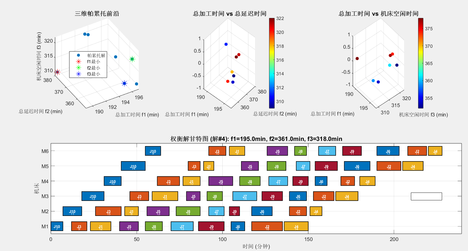 运行结束后,命令行会输出帕累托最优解集和典型解详细信息,同时弹出最终的可视化图表(帕累托前沿+甘特图)。