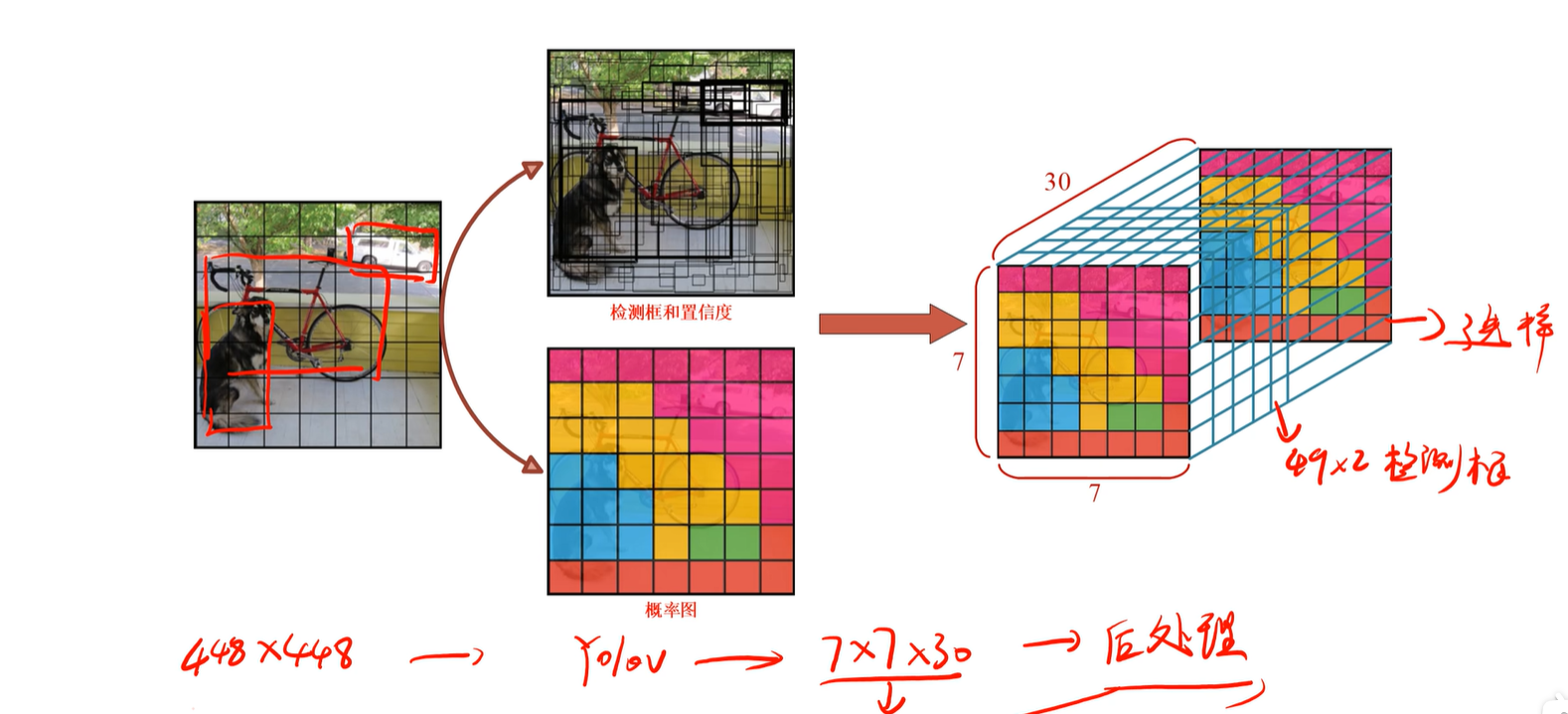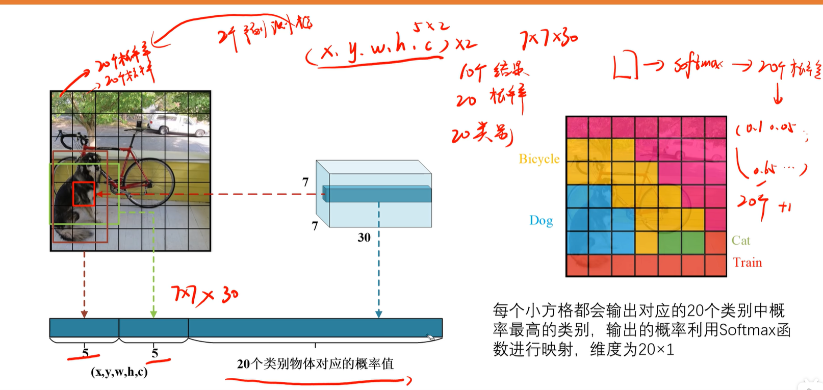 7x7个框,每个框对应20个类别的概率,每个小框有2个候选框,它们共用20个类别的概率