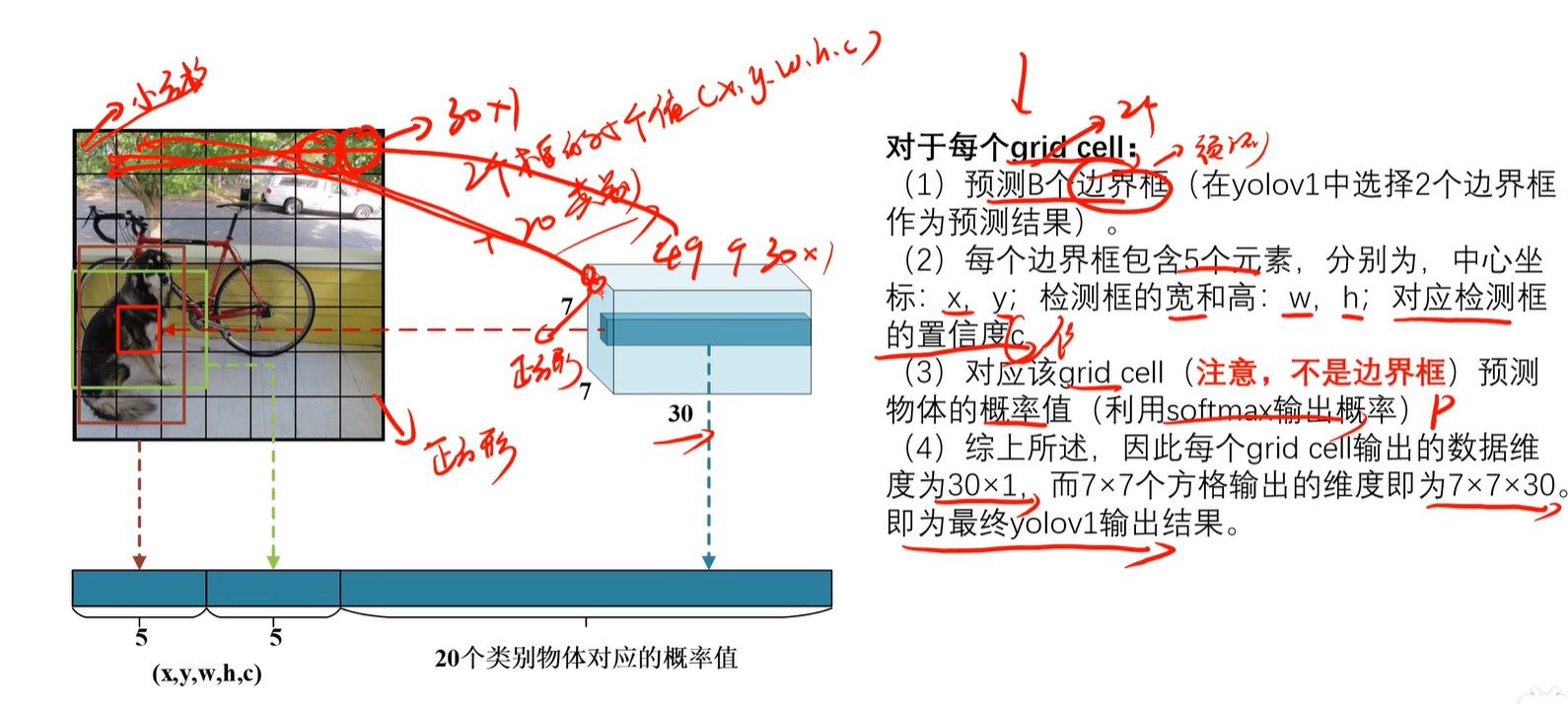 注意:这里每个小方格输出两个框,每个框数据包括(x,y,w,h,c)再加上20个分类的概率=30