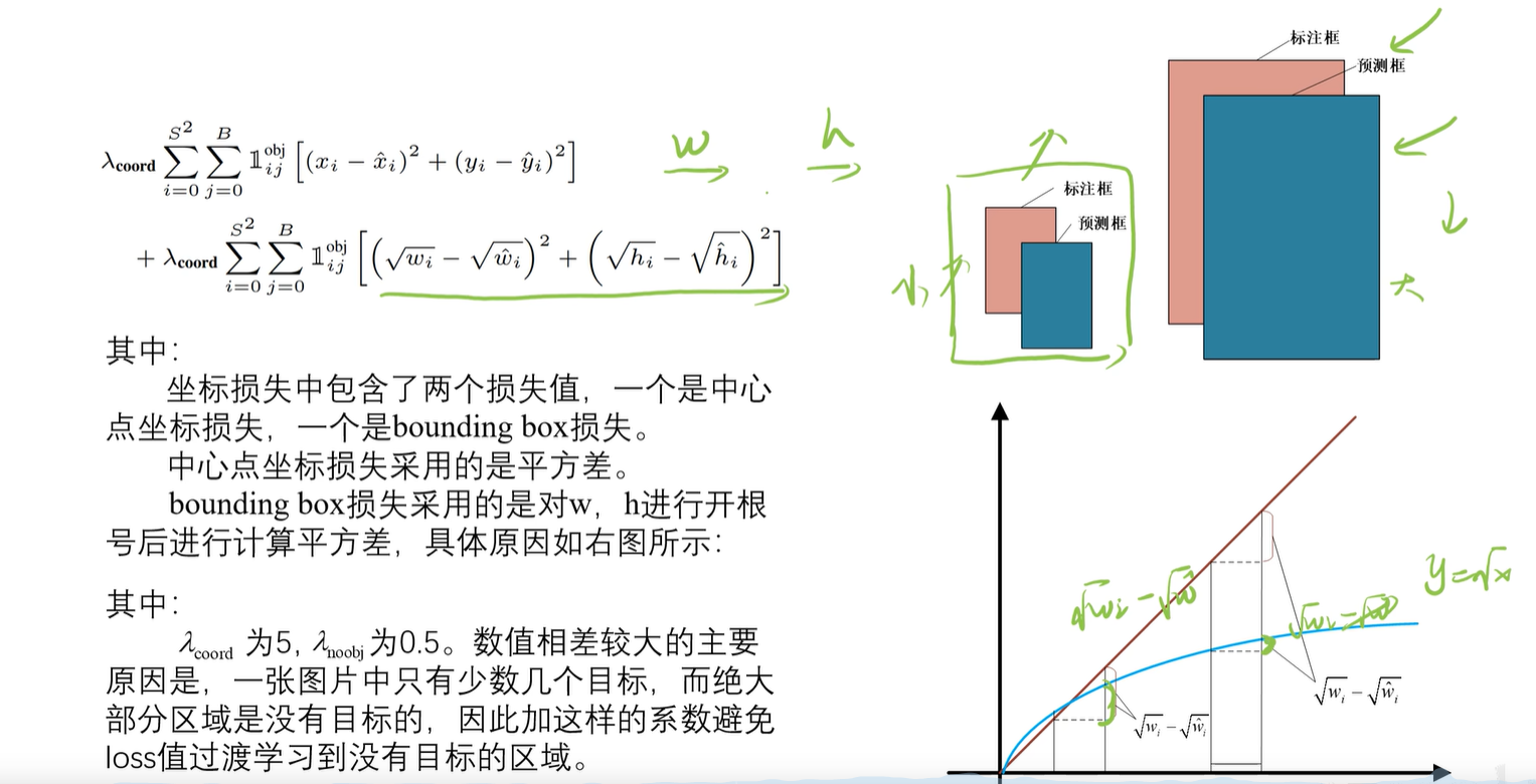 计算wh的时候增加了根号,是由于小物体看起来误差会大一些,大物体会小一些,但是由于小物体的值更小,使得计算出来的误差值比大物体还小,为了解决这样的问题,加上根号再计算,放大小物体的误差,抑制大物体的误差