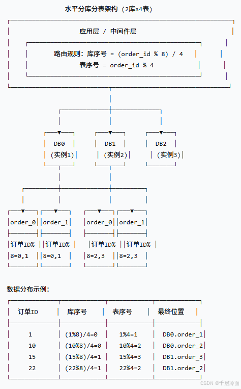 库序号 = (order_id % 8) / 4,表序号 = order_id % 4。 order_id = 17,17 % 8 = 1,1 / 4 = 0(库0),17 % 4 = 1(表1),最终落在db_0.order_1。