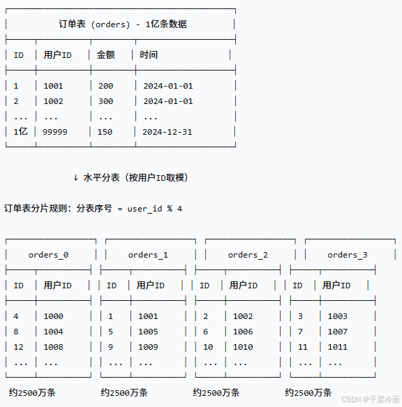 订单表按user_id取模,拆分到order_0,order_1,order_2,order_3四张表中。 - 示例: