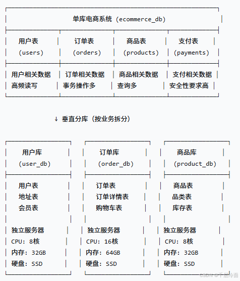 - 按业务领域划分,如电商系统分为:用户库、订单库、商品库、支付库等。