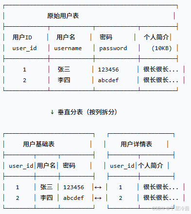 用户表(user_id, username, password, phone, avatar, personal_bio, create_time, ...),其中personal_bio(个人简介)是长文本,不常查询。 - 拆分后 :